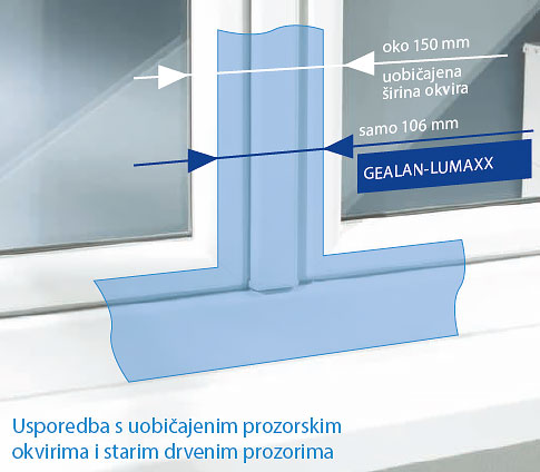 Za vrijeme razvijanja sistema GEALAN-LUMAXX® optimirana je cjelokupna geometrija prozorskih okvira tako da su širine profila svedene na minimum. Pri tome su konstruktori pazili na ravnotežu između svojstava toplinske izolacije i statike, kao i na savršeno funkcioniranje okova. Simetrično djelovanje uskog mono štulpa dodatno pridonosi fleksibilnoj uporabi pri ugradnji prozora.